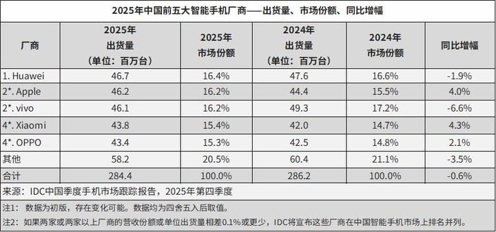 - 华为在 2025 年全年重返中国智能手机出货量榜首,全年出货量约 4670 万台,市场份额 16.4%。