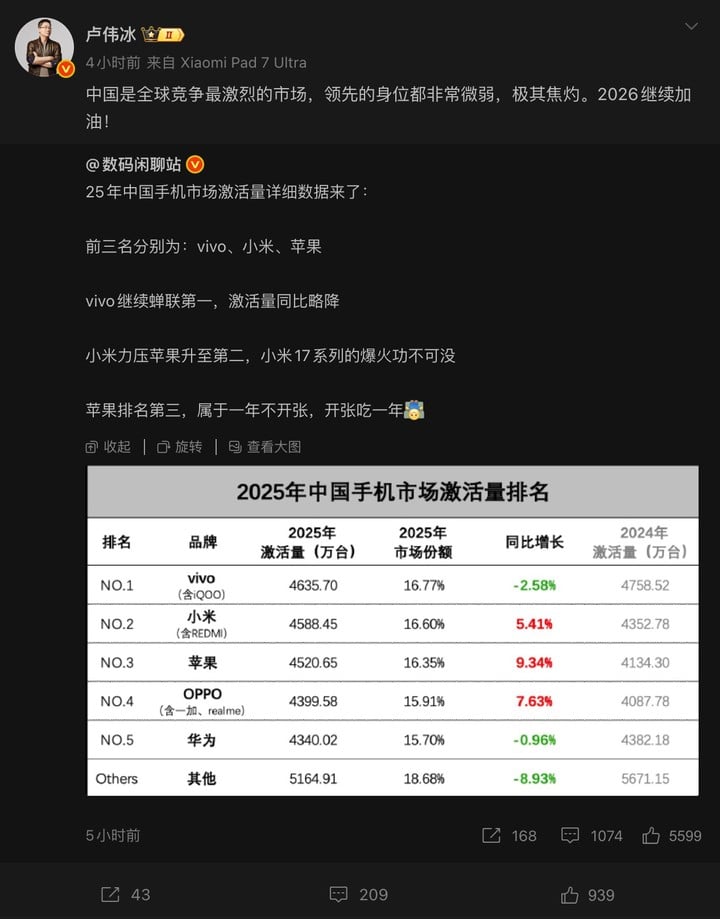 小米去年激活量反超苹果升至第二,卢伟冰:竞争「极其焦灼」