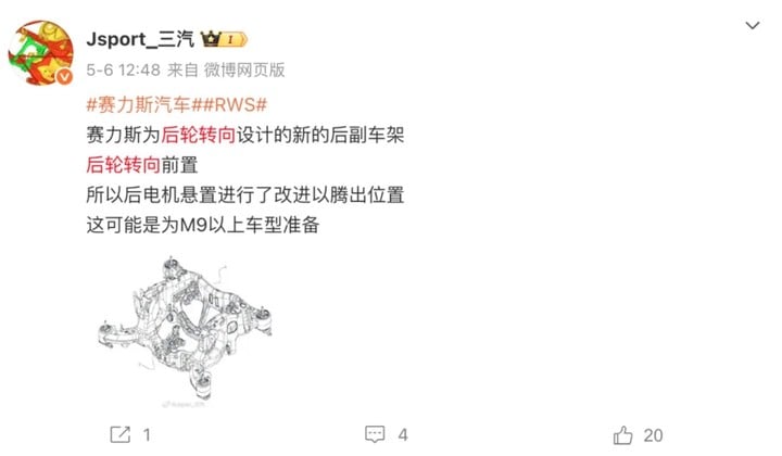 如此之长的车身自然需要匹配更为灵活的后轮转向系统,之前就有博主曾在社交媒体上晒出过一组赛力斯专为后轮转向设计的新款后副车架设计图。此设计将后轮转向机构前置,为后电机悬置腾出了空间。