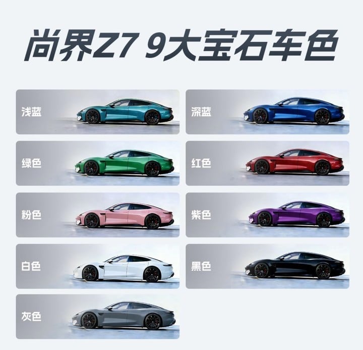 尚界 Z7 定位中大型纯电轿跑,车身长度超 5 米,轴距约 3 米,车高控制在 1.4 至 1.5 米之间,整体姿态低趴、运动感十足外观酷似保时捷 Taycan,外观上将提供 9 种车身颜色和 5 种轮圈选择。