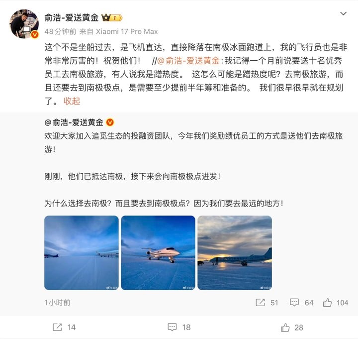 一个月前,俞浩曾公开表示将送十名优秀员工前往南极,当时引发部分质疑。他在最新发文中回应称,相关负面评价多为「无中生有、添油加醋或以偏概全」。他强调,若公司真的对员工不好,「员工都是有腿的」,不会选择留下。