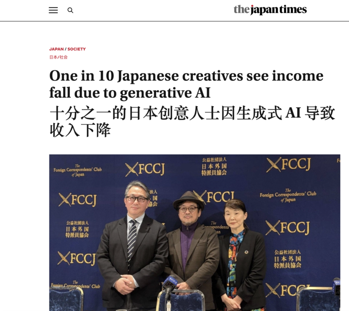 日本自由职业者联盟呼吁政府尽快推进相关立法,包括训练数据透明化、AI 生成内容标识制度以及创作者收益分配机制等。