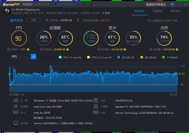而在酷睿 Ultra X9 388H,特别是这个 12 核 Xe3 GPU 的加持下,毫不夸张的说,这台「轻薄本」几乎有着等同于 3060 显卡,或者说 PS5 主机级别的游戏能力。