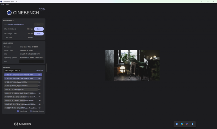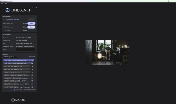 Cinebench R24 中,388H CPU 离电单核跑分 130,多核跑分 1121,连电单核 127,多核 1314。