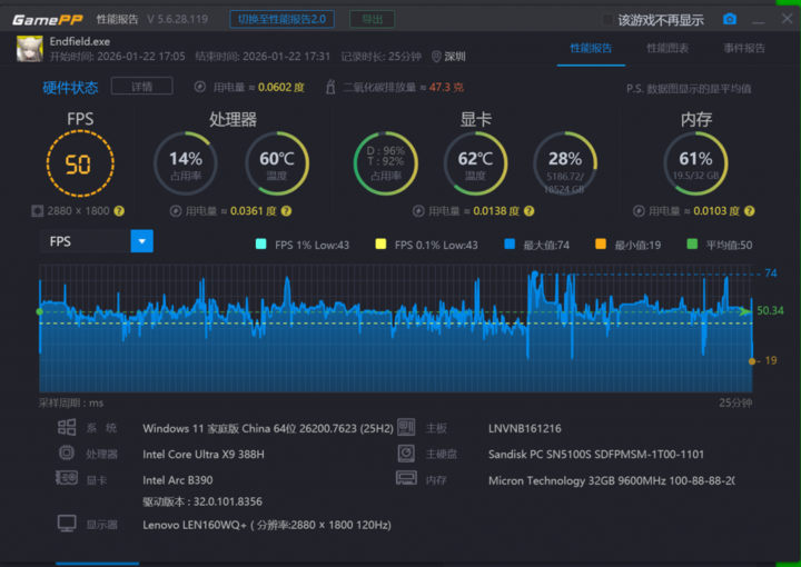 跑分仅供参考,游戏的实际体验更能直观体现性能的进步。这次,我们用这颗新处理器,玩上了最新推出的《明日方舟:终末地》。
