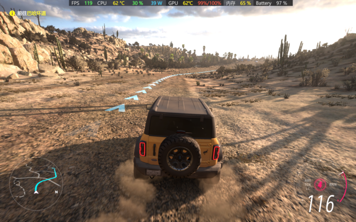 我们测试的几款游戏中,画面表现最好的当属《极限竞速:地平线 5》,不仅 1080P 高画质下能跑 120fps,还能开中等光追效果,跑车开起来心旷神怡。
