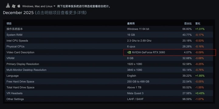 去年 12 月的 Steam 硬件调查显示,RTX 3060 依旧是这个平台上使用率最高的显卡,证明即使这已经是接近 5 岁的产品,依旧是一个足以应对大部分大型游戏的性能标杆。