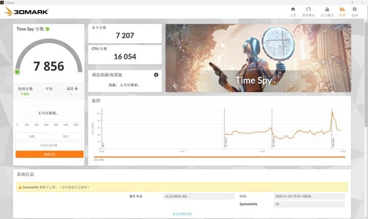 3D Mark 的 Time Spy 环节,388H 的离电得分为 7856 分(GPU 分 7207分,CPU 分 16054),连电得分为 7896 分(GPU 分 7240分,CPU 分 16240),这个水平确实与 3060 入门级游戏本水平相当。