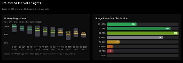 ▲ 参与调查的 950 辆特斯拉中,有 275 辆保持在 85-90% 的电池健康度区间。