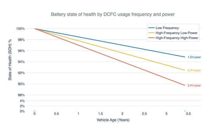 - 频繁大功率快充(超过 40% 的充电发生在 100 kW 以上):年均衰减约 3.0%,8 年后仅约 76%。