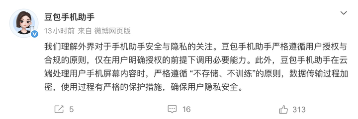昨晚,豆包手机助手在微博发文,再次回应了隐私安全相关的质疑。