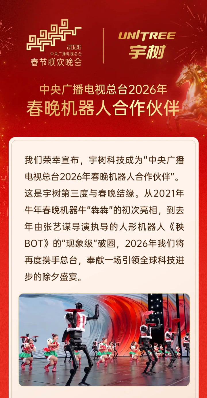昨天,宇树宣布成为今年央视春晚的机器人合作伙伴,并确认其机器人产品将参与今年春晚舞台的正式演出。