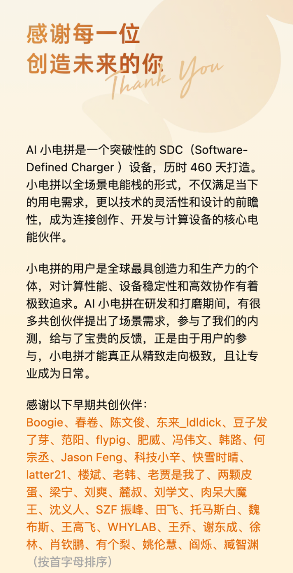 作为一支专注「先锋电能产品」的团队,我们在过去一年,陆续推出了贴贴线、细雳线、小电拼,首创并践行了 SDC(Software-Defined Charger)的理念,让硬件可以被软件定义,让协议与算法能不断演进。我们还开放了 AI 小电拼的 68 万行 C + + 代码,把积累的经验分享给更多人,希望能推动整个行业往前走。