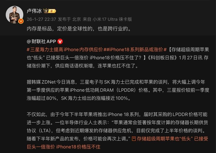 值得注意的是,昨晚小米集团总裁卢伟冰在微博上转发相关报道,称「内存是标品,定价是全球性的,也是跨行业的」,侧面印证了当前存储涨价已成为行业普遍现象。