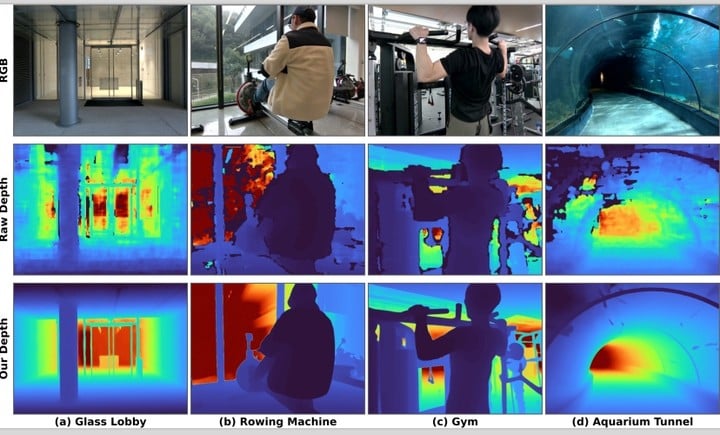实验显示,搭载该模型的奥比中光 Gemini 330 系列相机在面对透明玻璃、强逆光等复杂场景时,成像效果优于 Stereolabs 的 ZED Stereo Depth 深度相机,无需更换硬件即可显著提升对高难物体的处理能力。