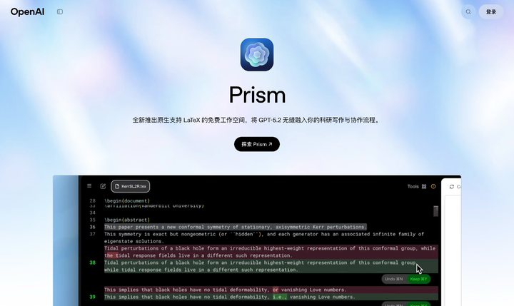 今天,OpenAI 正式推出全新的科研写作与协作工具 Prism,一个由 GPT‑5.2 驱动、原生支持 LaTeX 的免费云端工作空间,面向所有 ChatGPT 个人账户用户开放,项目数量与协作人数均不设上限。