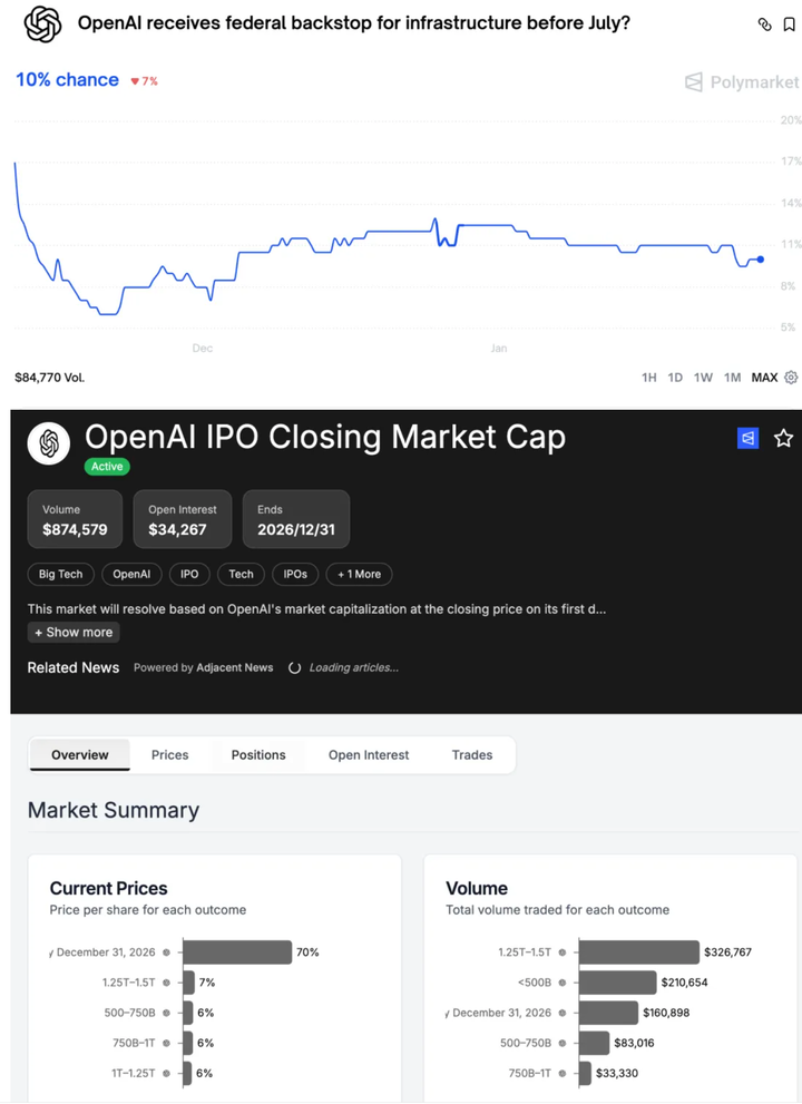 有人在为 OpenAI 上市时的市值下注,估值各不相同;也有人在赌政府是否会在今年 7 月之前出手救助 OpenAI;还有人押注 OpenAI 会在 2027 年前被其他公司收购。