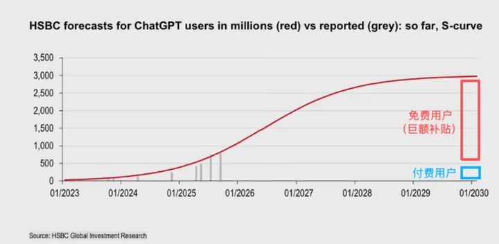 即便到了 2030 年 OpenAI 能实现 2-3 亿不等的付费用户,OpenAI 仍然需要支付巨额的算力成本去补贴其余 27-28 亿使用 ChatGPT 的免费用户。