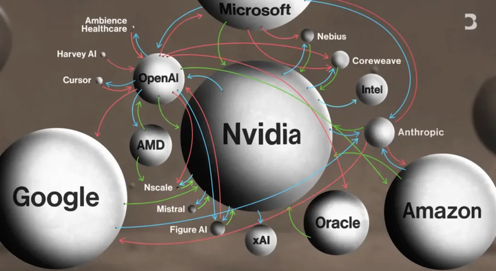 OpenAI 在过去一年里与英伟达、甲骨文、微软、AMD、CoreWeave、Google 等公司,达成了极其复杂的连锁交易。在这些交易当中,OpenAI 或许能够获得一些周转资金,或是基础设施费用的减免。
