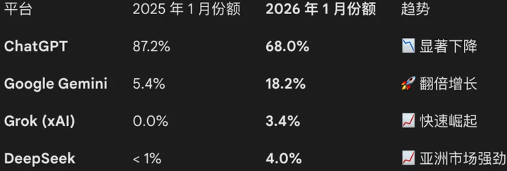 虽然 ChatGPT 在 2025 年曾一度凭借网页端超过 80% 的流量(数据源自 Visual Capitalist)建立起接近垄断的优势,但到了 2026 年初,这种优势正在被迅速蚕食。