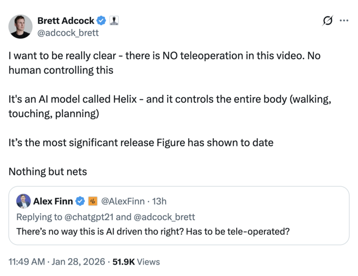 Brett Adcock,Figure AI 的创始人兼 CEO 在 X 上强调: