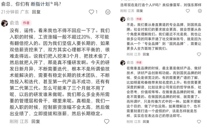 俞浩表示,追觅在招聘时的薪资涨幅通常不超过 20%,不存在外界所称的「翻倍挖人」。