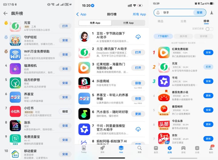 凭借 AI 社交新功能「元宝派」内测以及春节 10 亿红包活动的推动,该应用成功登顶华为应用商城飙升榜,并位列苹果中国区 App 免费榜第二、vivo 应用商城下载榜第二 。