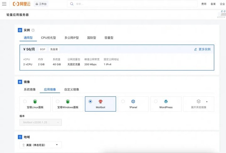 阿里云表示,Moltbot 的部署流程已在轻量应用服务器中实现镜像化,用户只需选择「Moltbot」应用镜像,即可完成基础环境搭建。