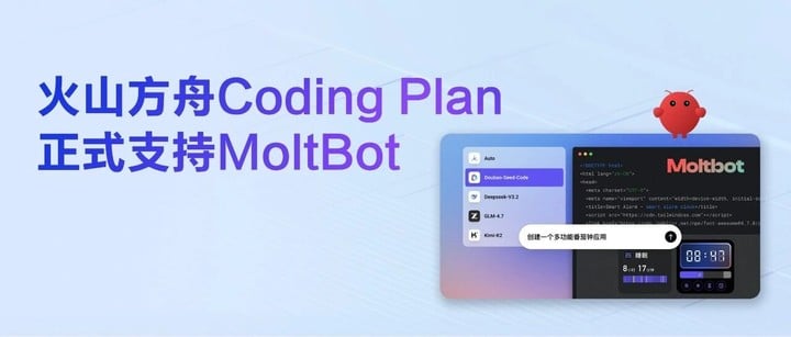 同时,火山方舟 Coding Plan 现已正式支持 Moltbot,解决部分开发者反馈的 Token 消耗量大等问题。