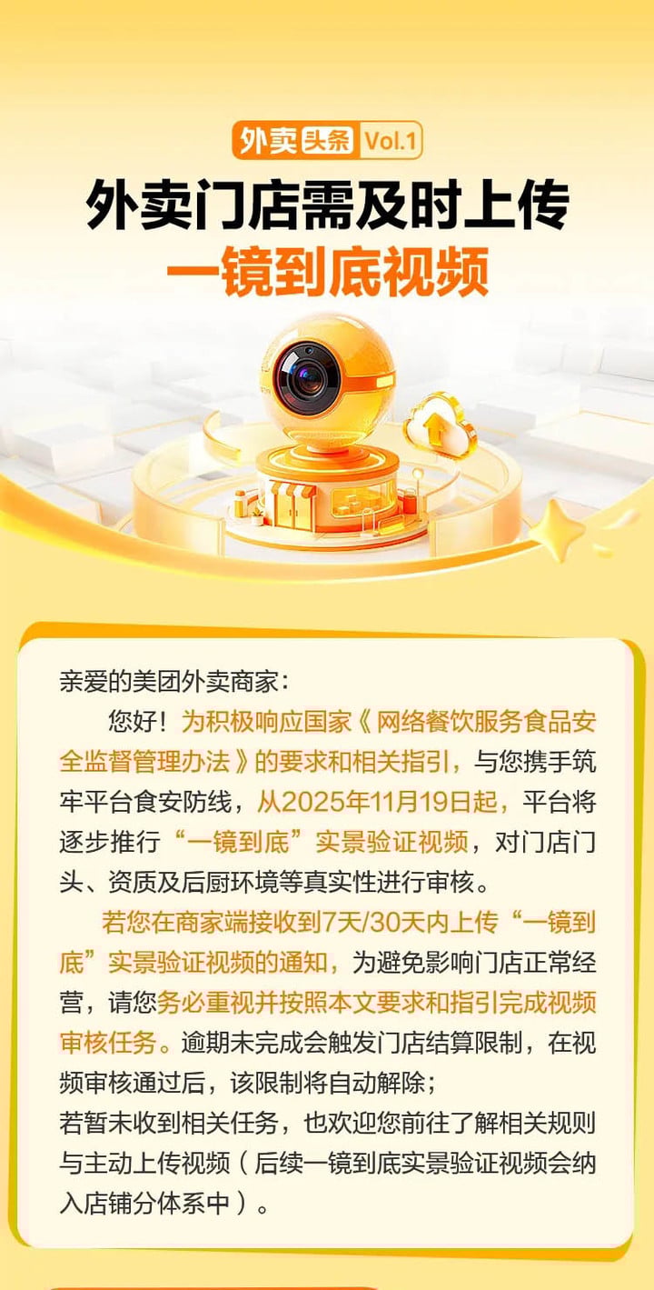据美团外卖商家中心信息,美团外卖近期在部分城市试点上线「一镜到底」门店真实性核验功能,并同步要求新入驻商家上传完整门店视频,以加强平台对商户资质、门头信息及后厨环境的审核力度。