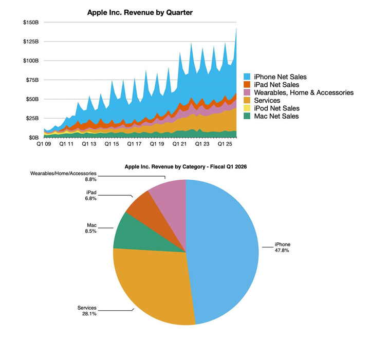 据路透社、《金融时报》报道,今天,苹果公布截至 2025 年 12 月 27 日的 2026 财年第一财季业绩,多个核心业务全面刷新纪录,并上调本财年第二季度(即 3 月季度)营收预期,显著强于华尔街此前预测。