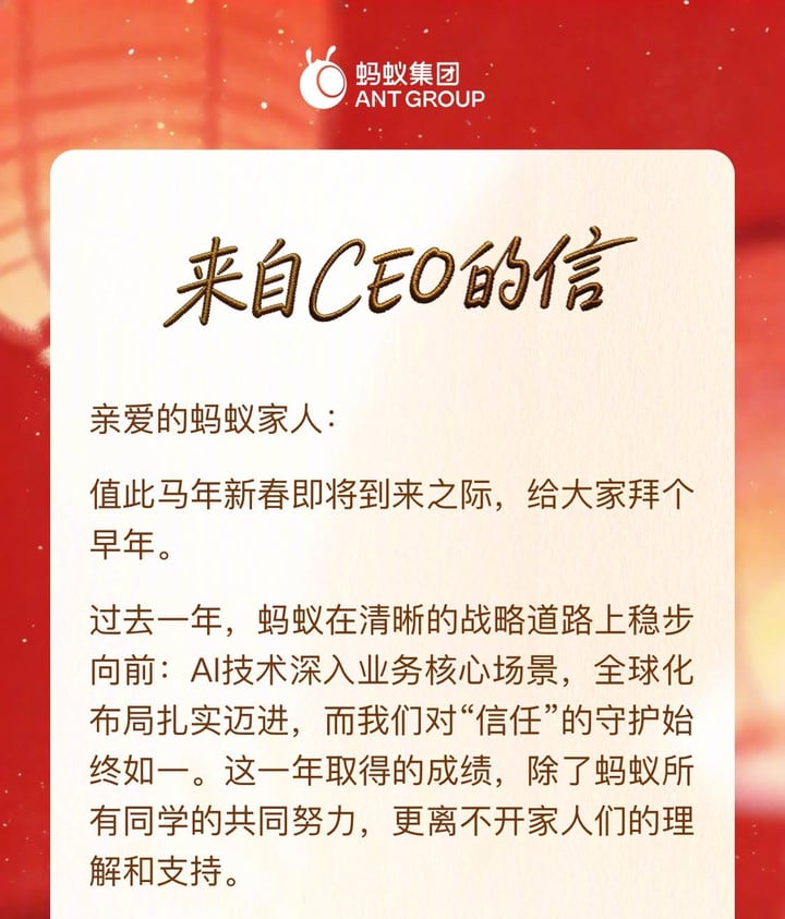 蚂蚁 CEO 发布内部信:AI、支付与全球化构成蚂蚁年度三大支柱