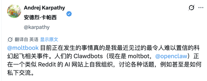 他还补充说:「Moltbook 是由我的 Clawdbot(现在叫 OpenClaw)运行和开发的。」