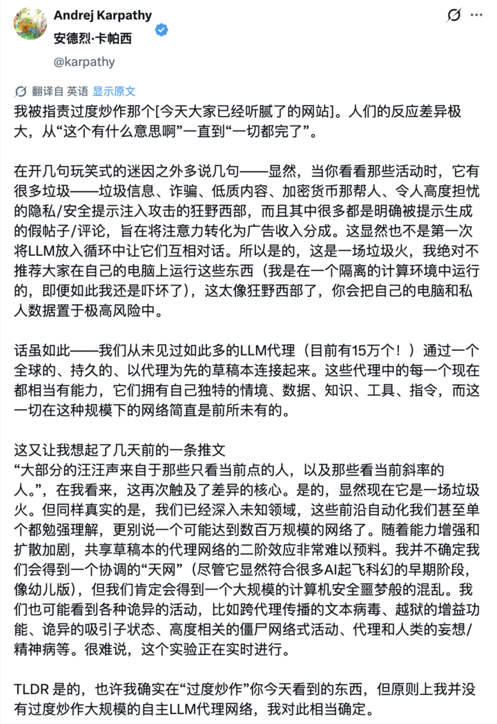 面对网友质疑 Karpathy 反应过度,他也再次发文回应: