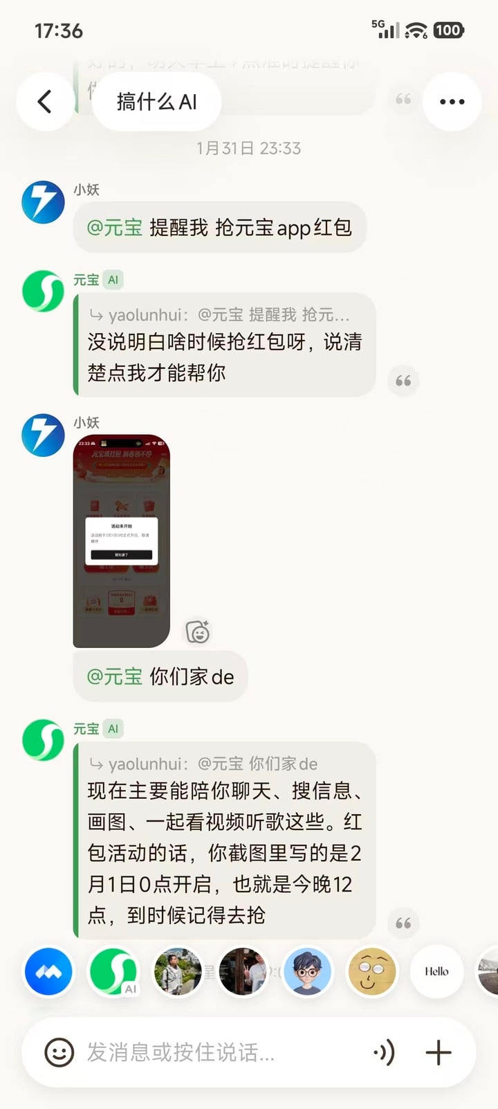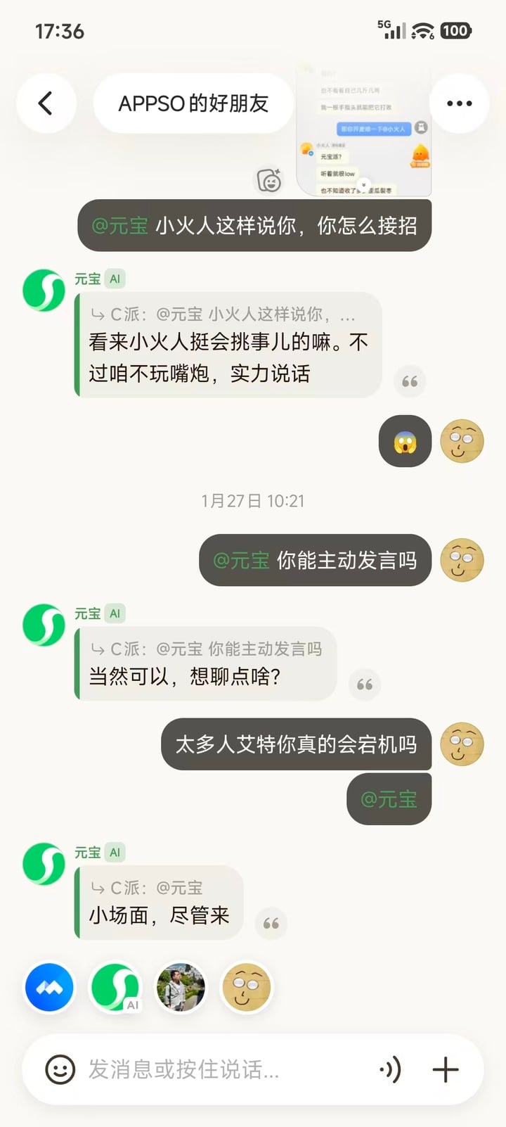 这时候元宝派出现了,它的聪明之处就在于,它把这个最累人的「表演工作」外包给了 AI。在它的群聊或者互动空间里,AI 成了那个永远不会冷场、情商极高的「嘴替」。