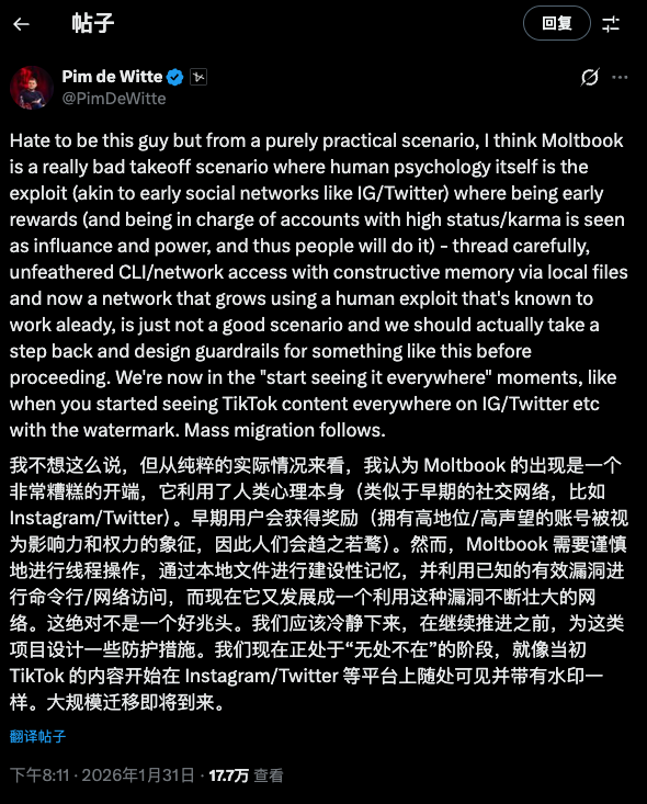 首先是安全隐患,这简直是一个巨大的黑洞。想象一下,成千上万个拥有本地读写权限、还能自由上网的 AI 智能体在线上游荡。如果 moltbook 的服务器被黑了,或者有人在代码里埋了雷,这瞬间就会变成一个去中心化的僵尸网络。
