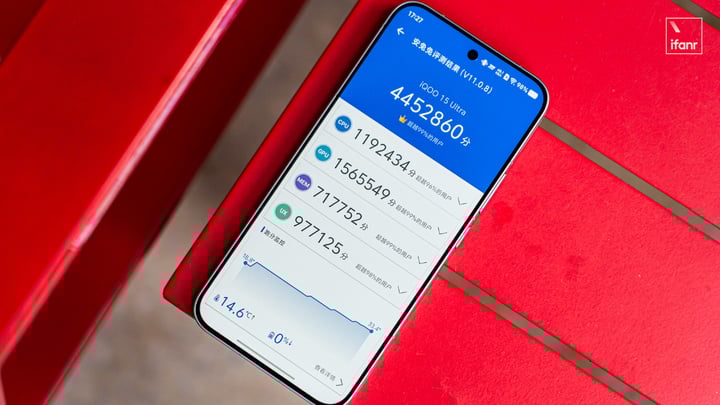 配置部分,iQOO 15 Ultra 搭载了第五代高通骁龙 8 至尊版移动平台,搭配自研电竞芯片 Q3,还有 LPDDR5X Ultra Pro 和 UFS4.1 的组合,最高支持 24GB RAM+1TB ROM,顶配的话就是真正的性能超大杯了。在常规的室内环境下,安兔兔跑分为 4452860。