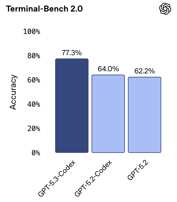 而在 Terminal-Bench 2.0(命令行操作)中,它更是拿下了 77.3% 的高分,把 GPT-5.2(62.2%)远远甩在身后。
