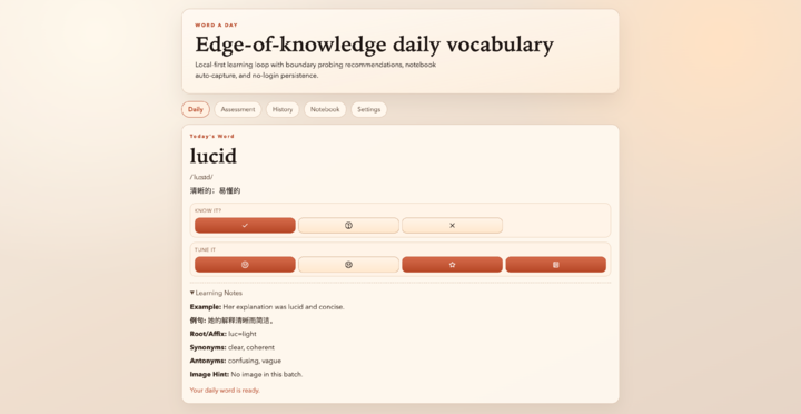 回到基础的编程能力,升级后的 GPT-5.3-Codex 表现也比 GPT-5.2 要好上不少。我们直接要求它写一个「每日一词」的 App。和在 ChatGPT 里面直接用 Canvas 给我们一个带不走的网页不同,Codex 能在本地从零开始,完成项目,然后使用 Vercel 或 Cloudflare 等 Skills 部署到网页上。