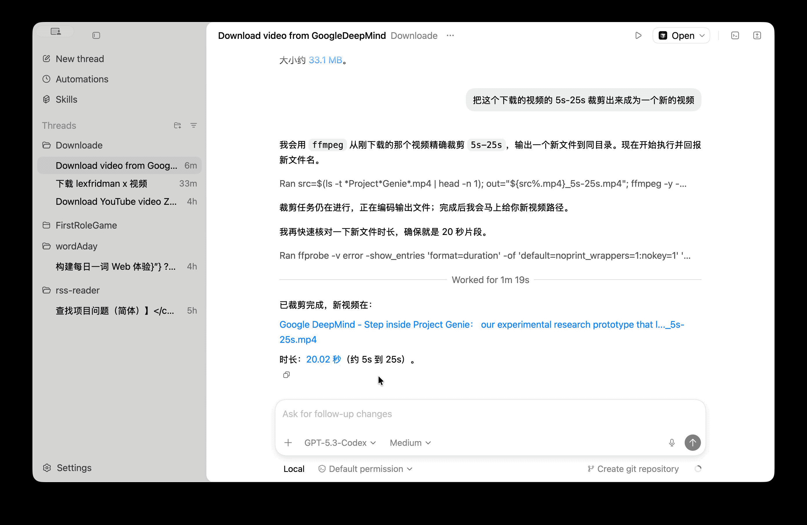 例如,我们这里下载了一个视频,然后要求它把视频的 5s-25s 裁剪出来成为一个新的视频;得益于 GPT-5.3-Codex 的 Token 快速处理,整个过程不需要很长时间,反而更多是取决于本地电脑的硬件解码编码能力。
