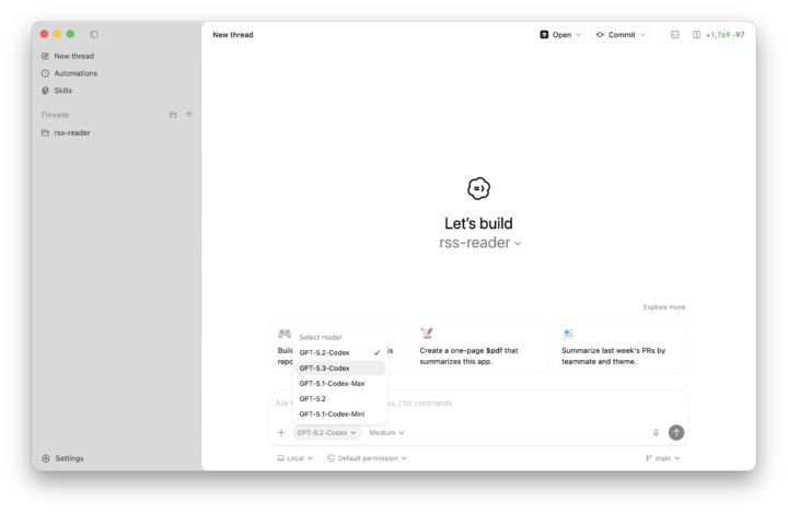 ▲ 在 Codex App 内可以直接选择 GPT-5.3-Codex 模型,也能选择深度思考的强度