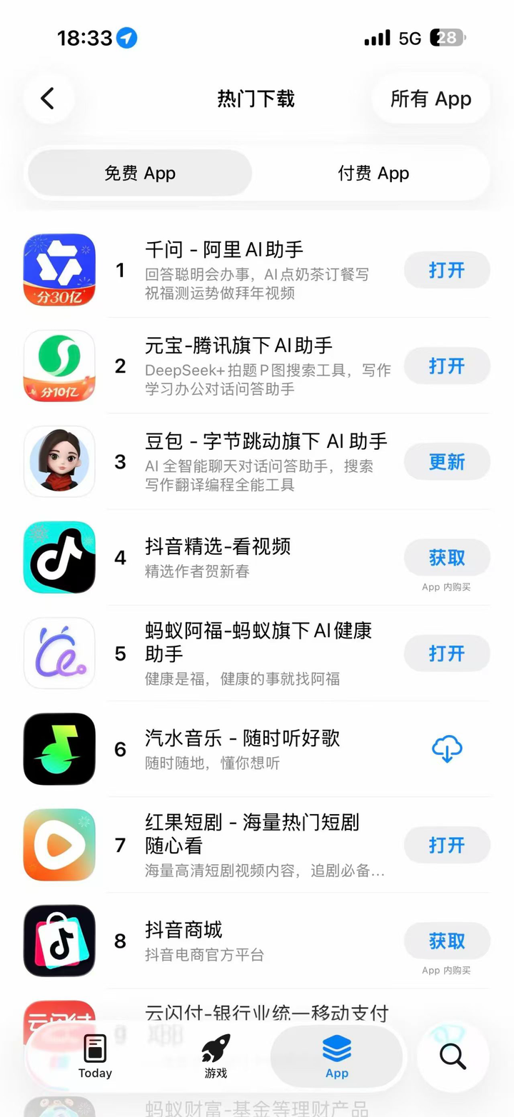 得益于活动的火爆,千问 App 昨天登上 App Store 免费 App 榜首,超越元宝和豆包。