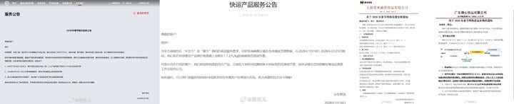 - 德邦:2026 年 1 月 19 日 – 2 月 14 日期间,将对部分客户、部分产品加收 0.2-0.5 元/kg;2026 年 2 月 15 日 – 2 月 23 日期间,将对部分客户、部分产品加收资源调节费。针对长期深度合作的客户,将按照双方合作产品,分别加收不同标准的资源调节费;