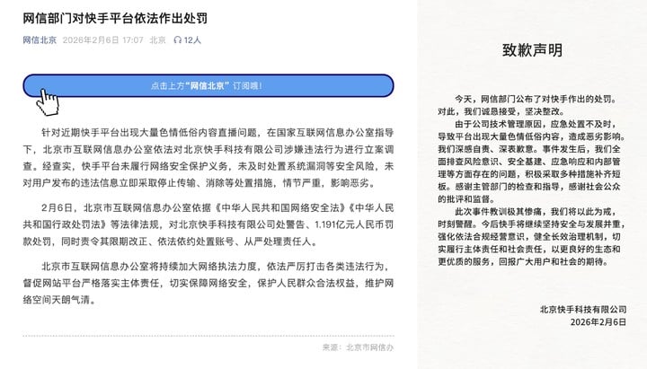 在处罚公布后,快手发布致歉声明,向公众表达歉意,并强调将进行全面整改。
