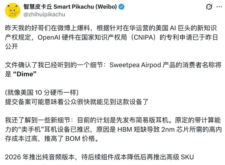 博主「智慧皮卡丘」最新爆料称,这款设备命名为「Dime」,寓意其体积小巧。
