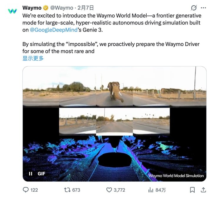 据《华尔街见闻》报道,Alphabet 旗下自动驾驶公司 Waymo 近日与 DeepMind 共同推出基于 Genie 3 的全新世界模型「Waymo World Model」。
