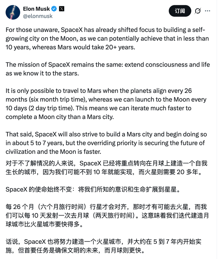 SpaceX 已经将重点转向在月球上建造一个自给自足的城市,因为我们可能不到 10 年就能实现,而火星则需要 20 多年。