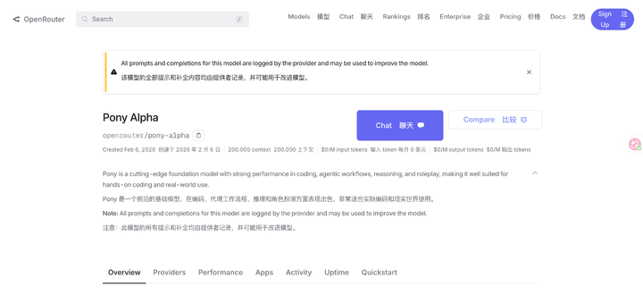 🔗 模型本人:https://openrouter.ai/openrouter/pony-alpha