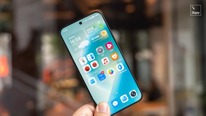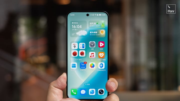 机身正面搭载了一块 6.31 英寸荣耀 AI 绿洲护眼屏,屏幕用了 1.08mm 极窄边框设计,配合小尺寸的机身,点亮之后机身正面就有种完全被屏幕覆盖的效果。