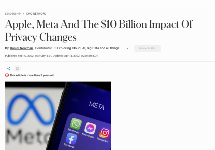 IDFA 是广告商在 Facebook 等第三方平台上进行定向投放时使用的唯一标识符。被切断之后,Meta 无法追踪用户是否在看到广告后进行了购买。这让 Meta 的广告投放变成了瞎子摸象,精准度大跌,广告商因此削减了在 Facebook 和 Instagram 上的预算。